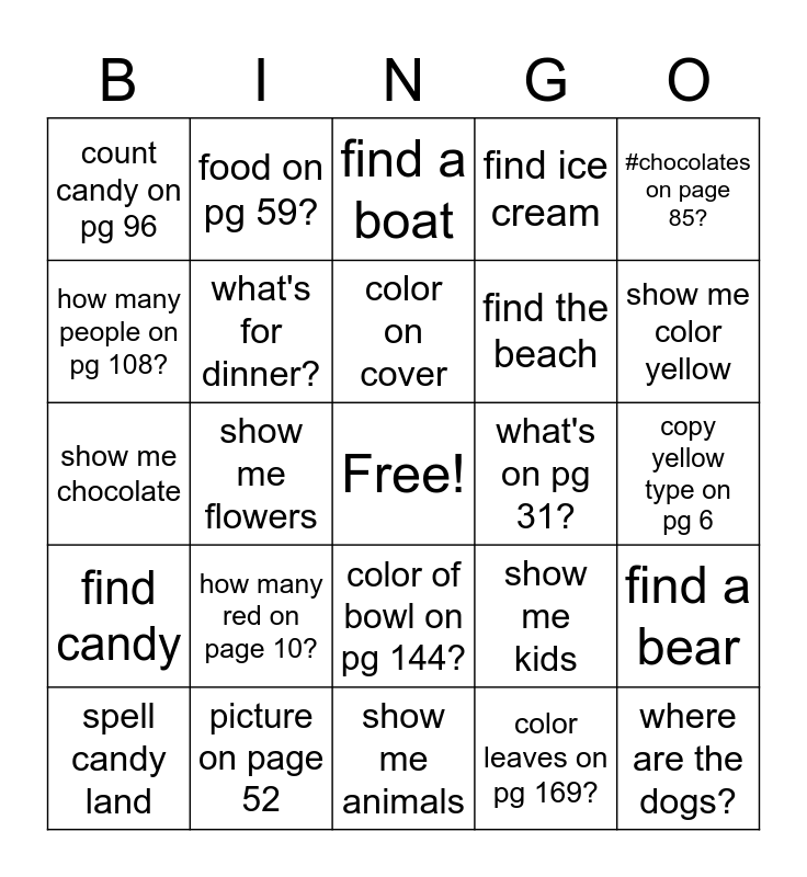 This bingo card has a free space and 24 words: how many red on page 10?, picture on page 52, color on cover, spell candy land, #chocolates on page 85?, count candy on pg 96, how many people on pg 108?, food on pg 59?, what's on pg 31?, color of bowl on pg 144?, find the beach, show me chocolate, show me kids, find a bear, what's for dinner?, color leaves on pg 169?, copy yellow type on pg 6, find a boat, show me color yellow, show me flowers, where are the dogs?, find candy, find ice cream and show me animals.