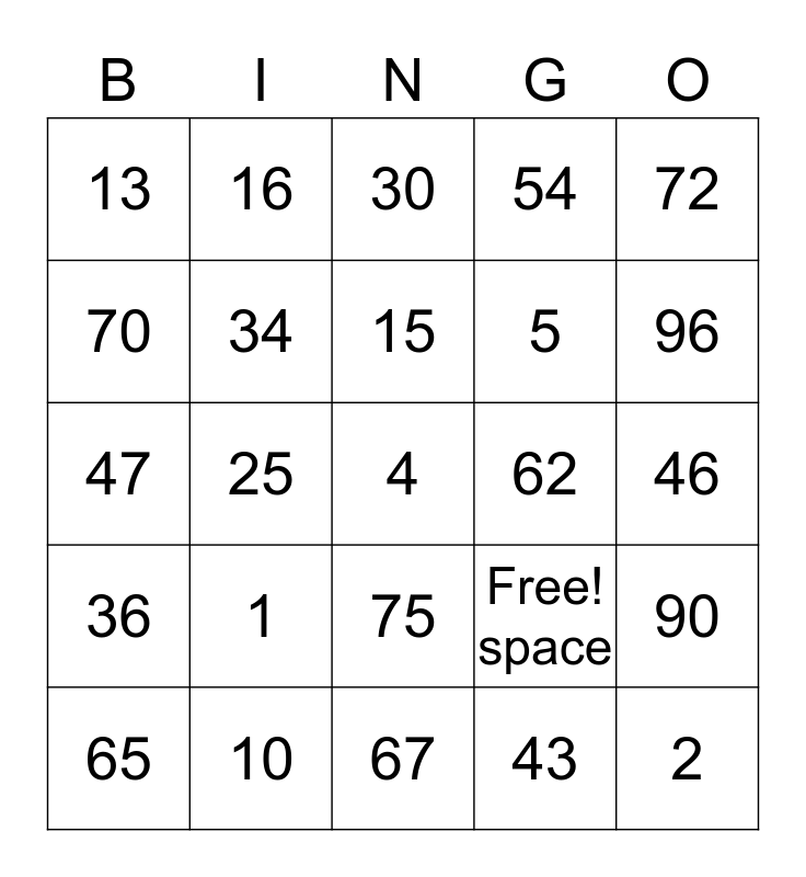 This bingo card has 25 words: 1, 67, 15, 65, 72, 13, 70, 16, 62, 75, 5, 47, Free! space, 90, 34, 2, 46, 30, 96, 25, 4, 10, 36, 54 and 43.