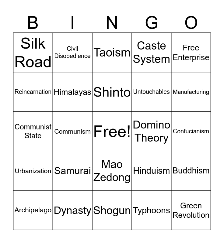 This bingo card has a free space and 24 words: Samurai, Dynasty, Shinto, Archipelago, Free Enterprise, Silk Road, Reincarnation, Civil Disobedience, Domino Theory, Mao Zedong, Untouchables, Communist State, Hinduism, Buddhism, Himalayas, Typhoons, Confucianism, Taoism, Manufacturing, Communism, Green Revolution, Urbanization, Caste System and Shogun.