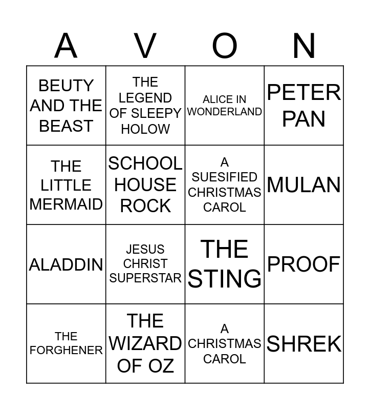 This bingo card has a free space and 15 words: THE FORGHENER, SHREK, ALICE IN WONDERLAND, BEUTY AND THE BEAST, MULAN, THE LITTLE MERMAID, JESUS CHRIST SUPERSTAR, A CHRISTMAS CAROL, SCHOOL HOUSE ROCK, ALADDIN, PROOF, PETER PAN, A SUESIFIED CHRISTMAS CAROL, THE LEGEND OF SLEEPY HOLOW and THE WIZARD OF OZ.