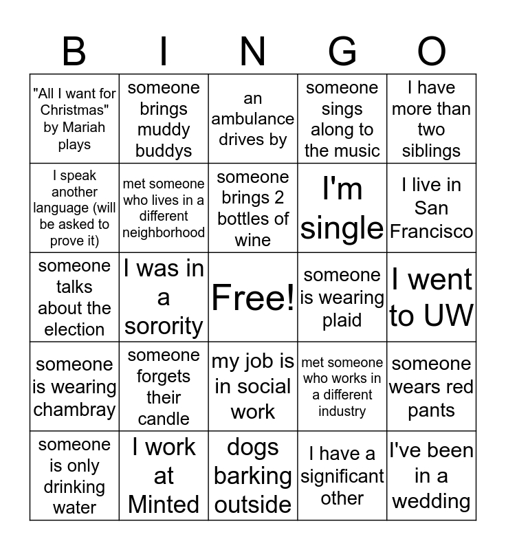 This bingo card has a free space and 24 words: someone forgets their candle, I work at Minted, someone brings 2 bottles of wine, someone is only drinking water, I have more than two siblings, "All I want for Christmas" by Mariah plays, I speak another language (will be asked to prove it), someone brings muddy buddys, someone is wearing plaid, my job is in social work, I'm single, someone talks about the election, met someone who works in a different industry, someone wears red pants, met someone who lives in a different neighborhood, I have a significant other, I went to UW, an ambulance drives by, I live in San Francisco, I was in a sorority, I've been in a wedding, someone is wearing chambray, someone sings along to the music and dogs barking outside.
