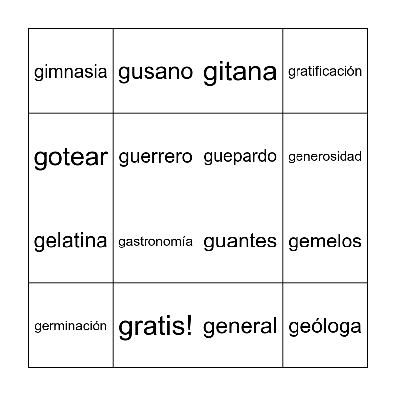 This bingo card has 16 words: gratis!, gemelos, gitana, gimnasia, gelatina, gusano, guantes, general, gotear, guerrero, germinación, gratificación, gastronomía, generosidad, guepardo and geóloga.