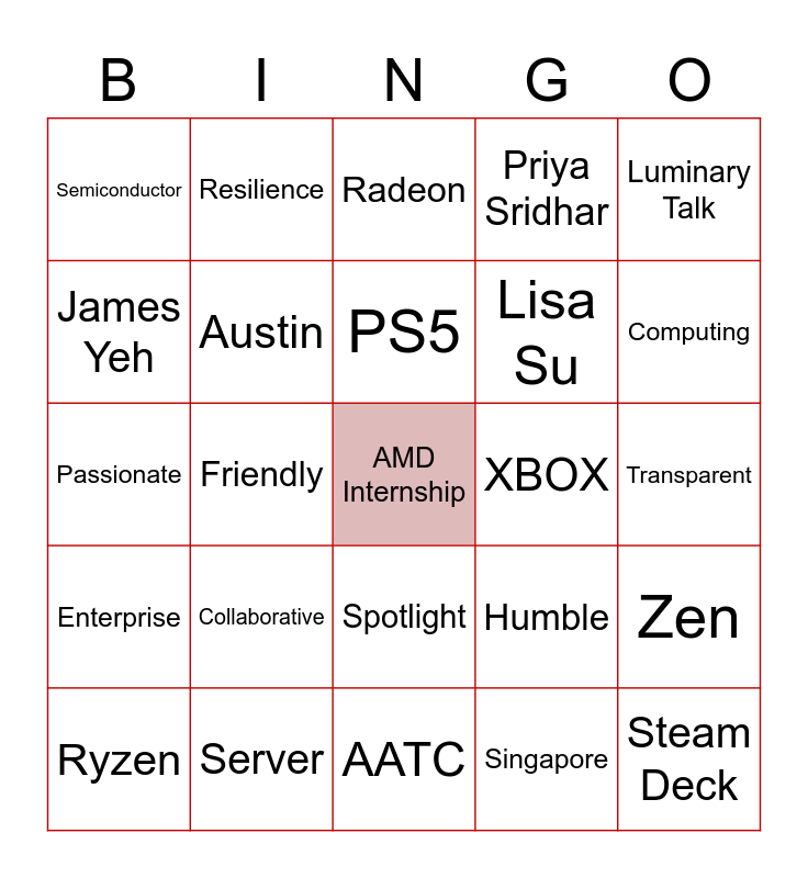 This bingo card has a free space and 61 words: SCBU, Server, Client, Enterprise, Singapore, Markham, Austin, together we advance_, Lisa Su, Derek Wong, Priya Sridhar, Anurag Bakhshi (Anu), James Yeh, Vincent Anasco, RDNA, Semiconductor, Steam Deck, Luminary Talk, Xilinx, PS5, XBOX, Radeon, Ryzen, Zen, Work-life balance, Volunteer, Innovative, Dedication, Computing, Yammer, Inclusive, Teamwork, Understanding, Flexible, Resilience, Imaginative, Supportive, Friendly, Welcoming, Passionate, Fun, Collaborative, Transparent, Respectful, Humble, Instinct, Raphael, EPYC, Cerrapoint, Spotlight, AATC, ATS, TTEC, Changi Business Park, Chai Chee, STEM, Pensando, GOQ, X3D, Chiplet and Monolithic.