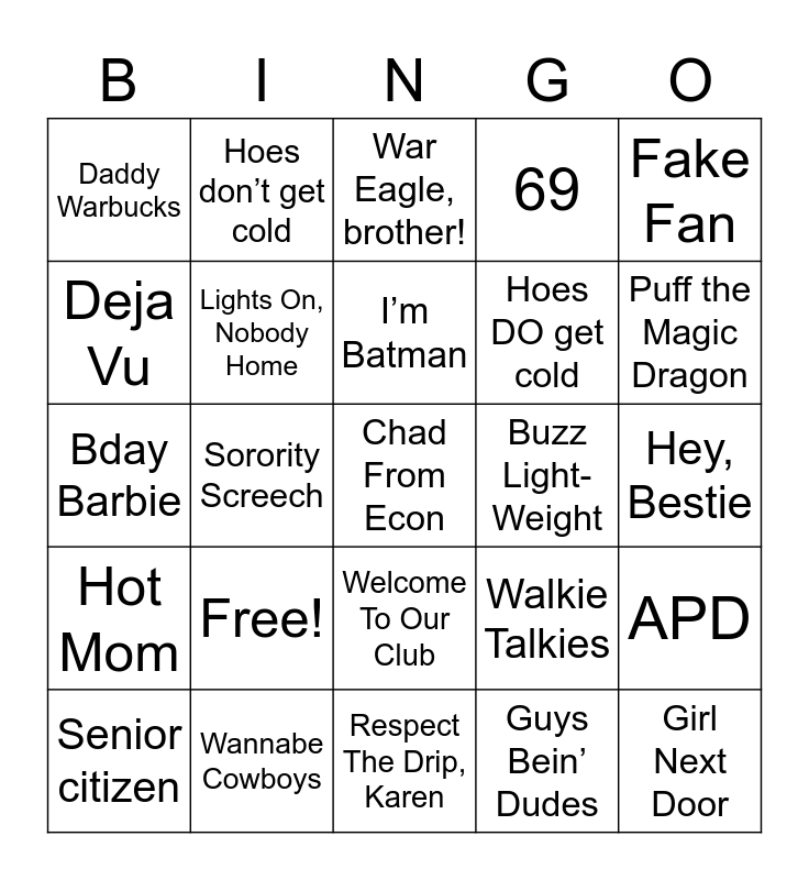 This bingo card has 25 words: Free!, Respect The Drip, Karen, I’m Batman, Senior citizen, Fake Fan, Daddy Warbucks, Deja Vu, Hoes don’t get cold, Buzz Light-Weight, Welcome To Our Club, Hoes DO get cold, Bday Barbie, Walkie Talkies, APD, Lights On, Nobody Home, Girl Next Door, Hey, Bestie, War Eagle, brother!, Puff the Magic Dragon, Sorority Screech, Chad From Econ, Wannabe Cowboys, Hot Mom, 69 and Guys Bein’ Dudes.