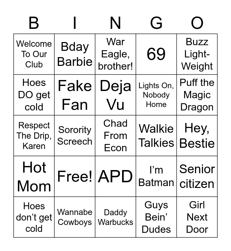 This bingo card has 25 words: Free!, Daddy Warbucks, Deja Vu, Hoes don’t get cold, Buzz Light-Weight, Welcome To Our Club, Hoes DO get cold, Bday Barbie, Walkie Talkies, APD, Lights On, Nobody Home, Respect The Drip, Karen, I’m Batman, Senior citizen, Fake Fan, Girl Next Door, Hey, Bestie, War Eagle, brother!, Puff the Magic Dragon, Sorority Screech, Chad From Econ, Wannabe Cowboys, Hot Mom, 69 and Guys Bein’ Dudes.
