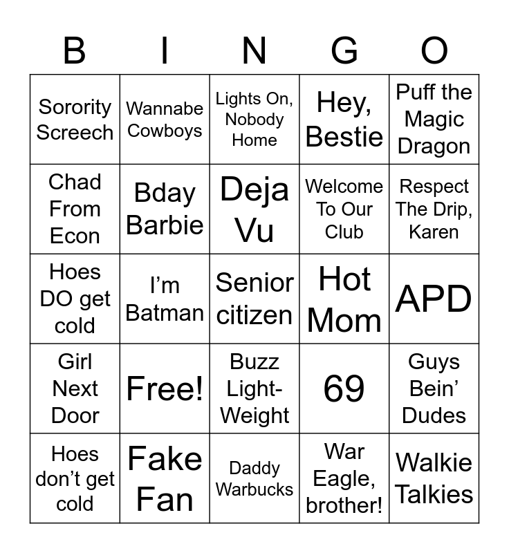 This bingo card has 25 words: Free!, Daddy Warbucks, Deja Vu, Hoes don’t get cold, Puff the Magic Dragon, Sorority Screech, Chad From Econ, Wannabe Cowboys, Hot Mom, Buzz Light-Weight, Welcome To Our Club, Hoes DO get cold, 69, Guys Bein’ Dudes, Bday Barbie, Walkie Talkies, APD, Lights On, Nobody Home, Respect The Drip, Karen, I’m Batman, Senior citizen, Fake Fan, Girl Next Door, Hey, Bestie and War Eagle, brother!.