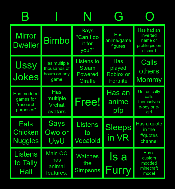 This bingo card has a free space and 24 words: Says Owo or UwU, Main OC has animal features., Listens to Steam Powered Giraffe, Listens to Tally Hall, Has had an inverted name or profile pic on discord, Mirror Dweller, Ussy Jokes, Bimbo, Has an anime pfp, Listens to Vocaloid, Has played Roblox or Fortnite, Has modded games for "research purposes", Sleeps in VR, Has a quote in the #quotes channel, Has multiple thousands of hours on any game, Is a Furry, Unironically calls themselves e-boy or e-girl, Says "Can I do it for you?", Calls others Mommy, Has multiple Vrchat avatars, Has a custom modded minecraft model, Eats Chicken Nuggies, Has anime/game figures and Watches the Simpsons.
