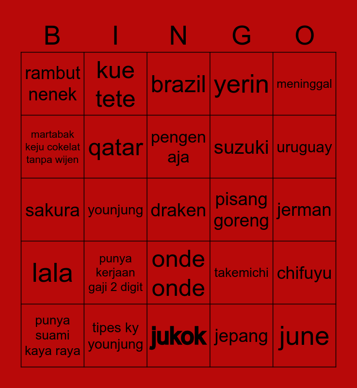 This bingo card has a free space and 24 words: punya kerjaan gaji 2 digit, tipes ky younjung, pengen aja, punya suami kaya raya, meninggal, rambut nenek, martabak keju cokelat tanpa wijen, kue tete, pisang goreng, onde onde, suzuki, sakura, takemichi, chifuyu, qatar, jepang, jerman, brazil, uruguay, younjung, june, lala, yerin and jukok.