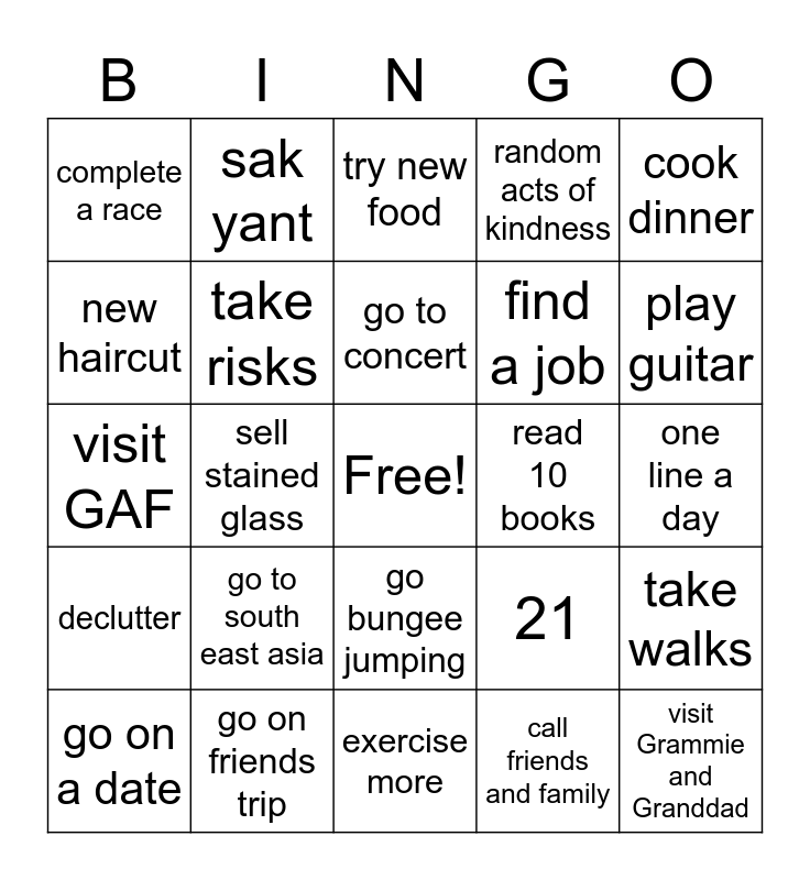 This bingo card has a free space and 25 words: go to south east asia, exercise more, go to concert, go on a date, cook dinner, complete a race, new haircut, sak yant, read 10 books, go bungee jumping, find a job, visit GAF, 21, take walks, take risks, go scuba diving, one line a day, try new food, play guitar, sell stained glass, visit Grammie and Granddad, go on friends trip, declutter, random acts of kindness and call friends and family.