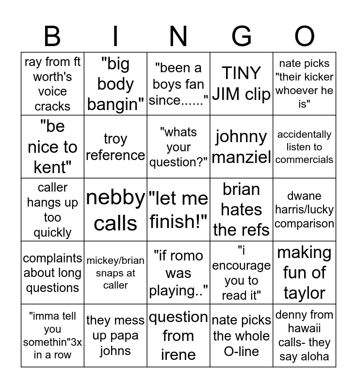This bingo card has a free space and 24 words: mickey/brian snaps at caller, they mess up papa johns, "whats your question?", "imma tell you somethin"3x in a row, nate picks "their kicker whoever he is", ray from ft worth's voice cracks, "be nice to kent", "big body bangin", brian hates the refs, "if romo was playing..", johnny manziel, caller hangs up too quickly, "i encourage you to read it", making fun of taylor, troy reference, nate picks the whole O-line, dwane harris/lucky comparison, "been a boys fan since......", accidentally listen to commercials, nebby calls, denny from hawaii calls- they say aloha, complaints about long questions, TINY JIM clip and question from irene.