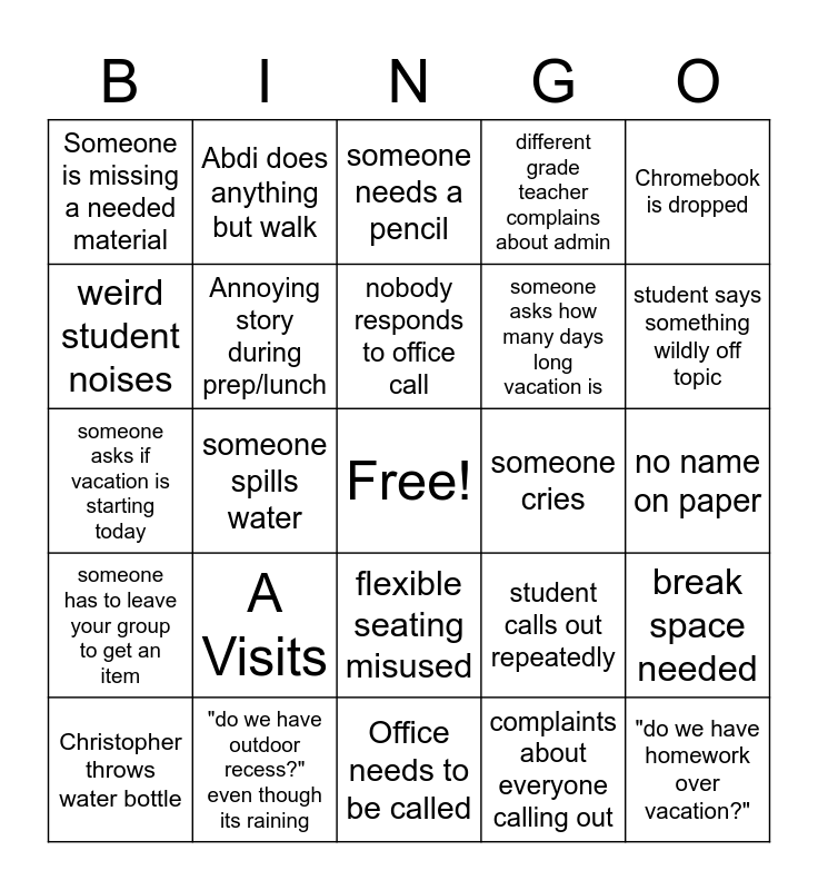 This bingo card has a free space and 25 words: A Visits, Office needs to be called, nobody responds to office call, Christopher throws water bottle, Chromebook is dropped, Someone is missing a needed material, weird student noises, Abdi does anything but walk, someone cries, flexible seating misused, someone asks how many days long vacation is, someone asks if vacation is starting today, student calls out repeatedly, break space needed, Annoying story during prep/lunch, admin visits 3rd floor, no name on paper, someone needs a pencil, student says something wildly off topic, someone spills water, "do we have homework over vacation?", "do we have outdoor recess?" even though its raining, someone has to leave your group to get an item, different grade teacher complains about admin and complaints about everyone calling out.