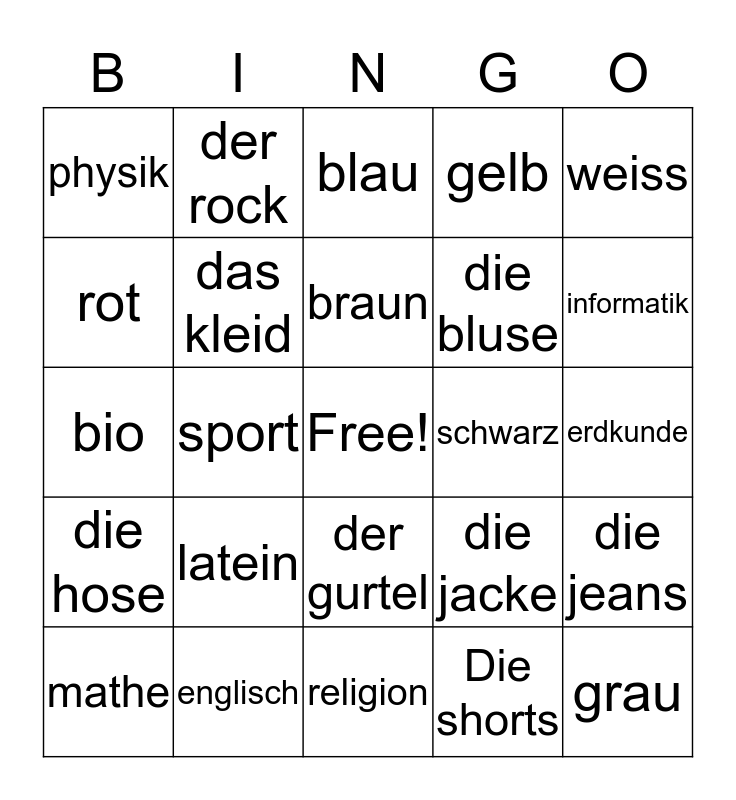 This bingo card has a free space and 24 words: latein, englisch, braun, mathe, weiss, physik, rot, der rock, schwarz, der gurtel, die bluse, bio, die jacke, die jeans, das kleid, Die shorts, erdkunde, blau, informatik, sport, grau, die hose, gelb and religion.