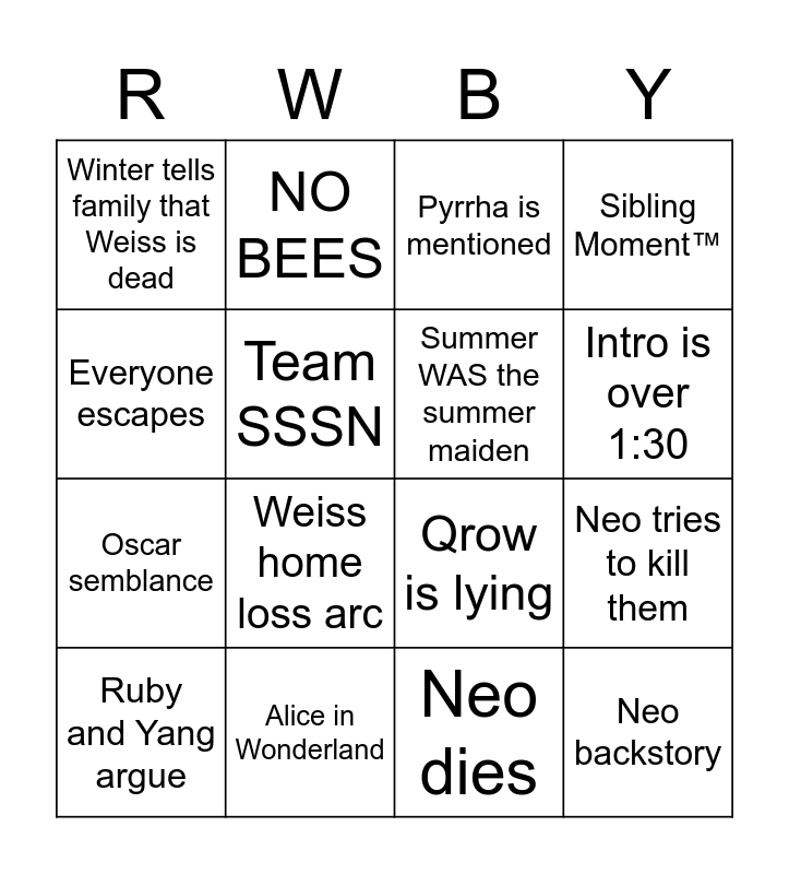 This bingo card has 16 words: Alice in Wonderland, Neo tries to kill them, Pyrrha is mentioned, Winter tells family that Weiss is dead, Oscar semblance, NO BEES, Qrow is lying, Neo dies, Everyone escapes, Team SSSN, Ruby and Yang argue, Sibling Moment™, Weiss home loss arc, Intro is over 1:30, Summer WAS the summer maiden and Neo backstory.