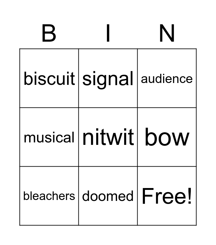This bingo card has 11 words: Free!, doomed, nitwit, bleachers, signal, audience, bow, unique, musical, biscuit and fuss.