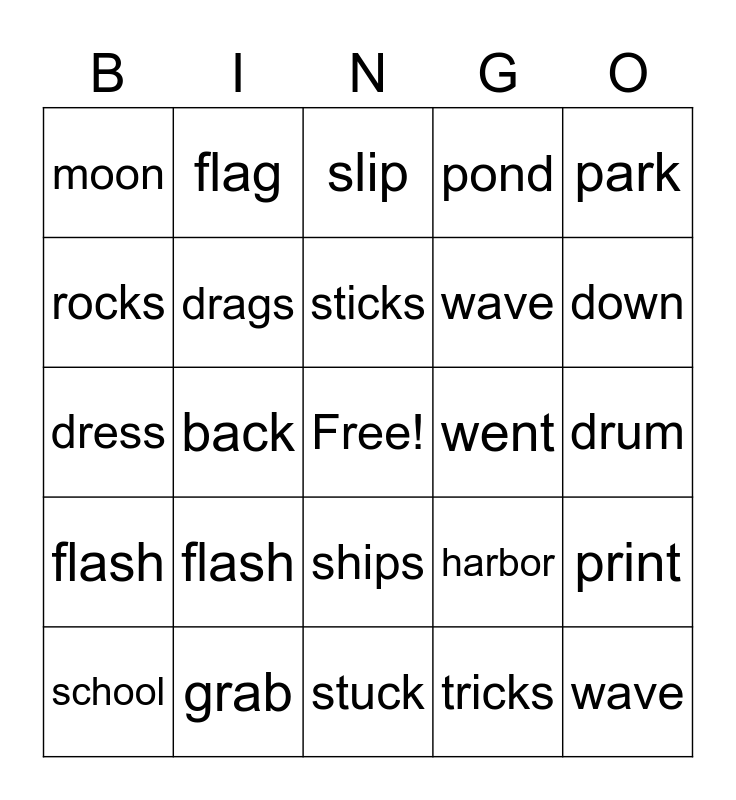 This bingo card has a free space and 24 words: flash, grab, sticks, school, park, moon, rocks, flag, went, ships, wave, dress, harbor, print, drags, tricks, drum, slip, down, back, wave, flash, pond and stuck.