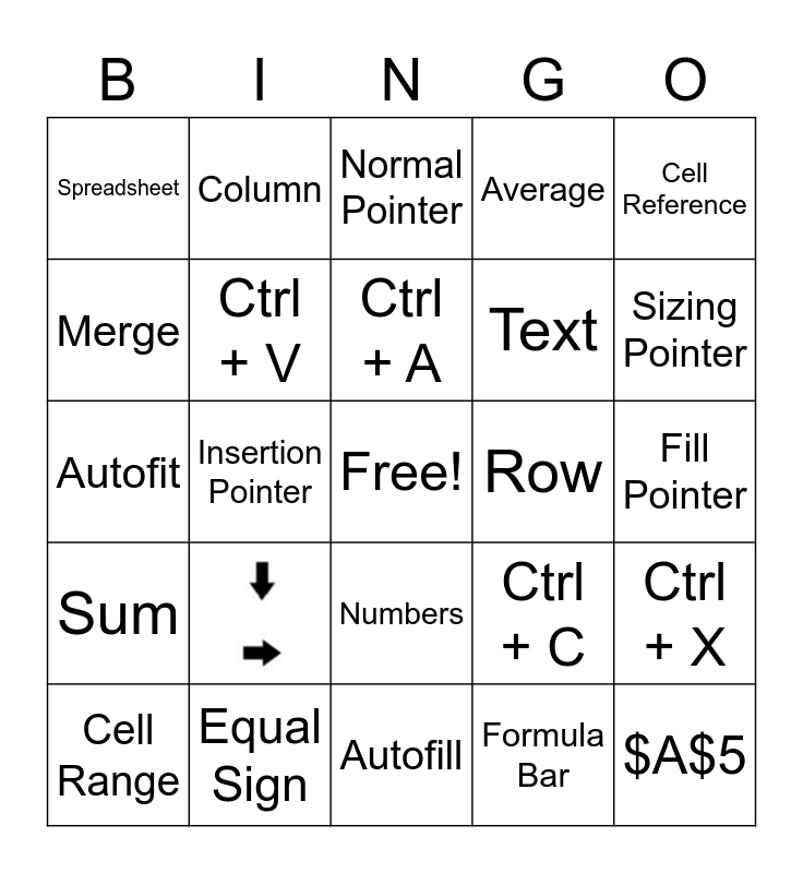 This bingo card has 1 images, a free space and 24 words: Autofill, Ctrl + A, Cell Range, Cell Reference, Spreadsheet, Merge, Column, Row, Numbers, Text, Autofit, Ctrl + C, Ctrl + X, Ctrl + V, Move Pointer, Fill Pointer, Normal Pointer, Sizing Pointer, Insertion Pointer, $A$5, Equal Sign, Sum, Average and Formula Bar.