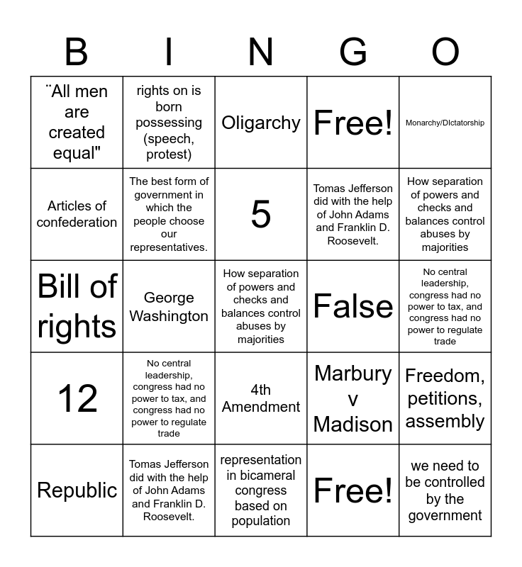 This bingo card has 30 words: Tomas Jefferson did with the help of John Adams and Franklin D. Roosevelt., The US Constitution, George Washington, A person rights to possess weapons, ¨All men are created equal", Oligarchy, The best form of government in which the people choose our representatives., 4th Amendment, False, representation in bicameral congress based on population, No central leadership, congress had no power to tax, and congress had no power to regulate trade, How separation of powers and checks and balances control abuses by majorities, Free!, we need to be controlled by the government, How separation of powers and checks and balances control abuses by majorities, natural rights, Marbury v Madison, 12, No central leadership, congress had no power to tax, and congress had no power to regulate trade, Monarchy/DIctatorship, Bill of rights, The Declaration of Independence, rights on is born possessing (speech, protest), Tomas Jefferson did with the help of John Adams and Franklin D. Roosevelt., Articles of confederation, Free!, Freedom, petitions, assembly, Republic, 5 and Separation of powers, checks & balances, federalism, popular sovereignty, limited government, judicial review, republicanism.