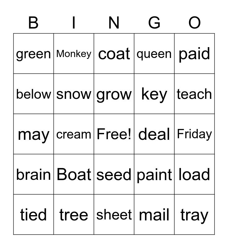 This bingo card has a free space and 24 words: Boat, tree, grow, tied, paid, green, below, Monkey, deal, seed, key, may, paint, load, snow, mail, Friday, coat, teach, cream, tray, brain, queen and sheet.