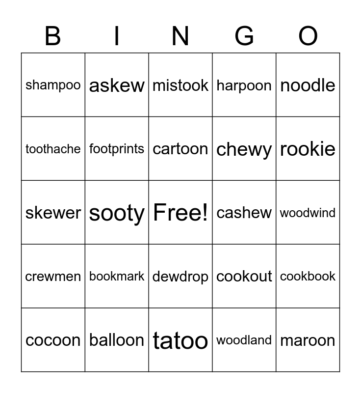 This bingo card has a free space and 24 words: bookmark, balloon, cartoon, cocoon, noodle, shampoo, toothache, askew, cashew, dewdrop, chewy, skewer, cookout, cookbook, footprints, woodland, woodwind, mistook, rookie, sooty, maroon, crewmen, harpoon and tatoo.