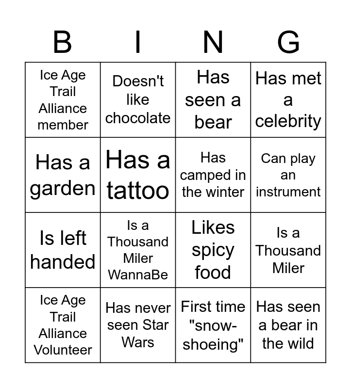 This bingo card has 16 words: Has never seen Star Wars, Is a Thousand Miler, Has seen a bear, Ice Age Trail Alliance member, Is left handed, Doesn't like chocolate, Likes spicy food, First time "snow-shoeing", Has a garden, Has a tattoo, Ice Age Trail Alliance Volunteer, Has met a celebrity, Is a Thousand Miler WannaBe, Can play an instrument, Has camped in the winter and Has seen a bear in the wild.