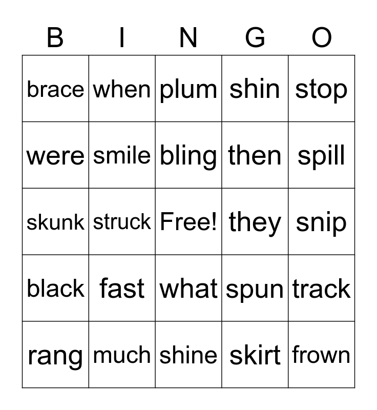 This bingo card has a free space and 24 words: fast, much, bling, rang, stop, brace, were, when, they, what, then, skunk, spun, track, smile, skirt, snip, plum, spill, struck, frown, black, shin and shine.