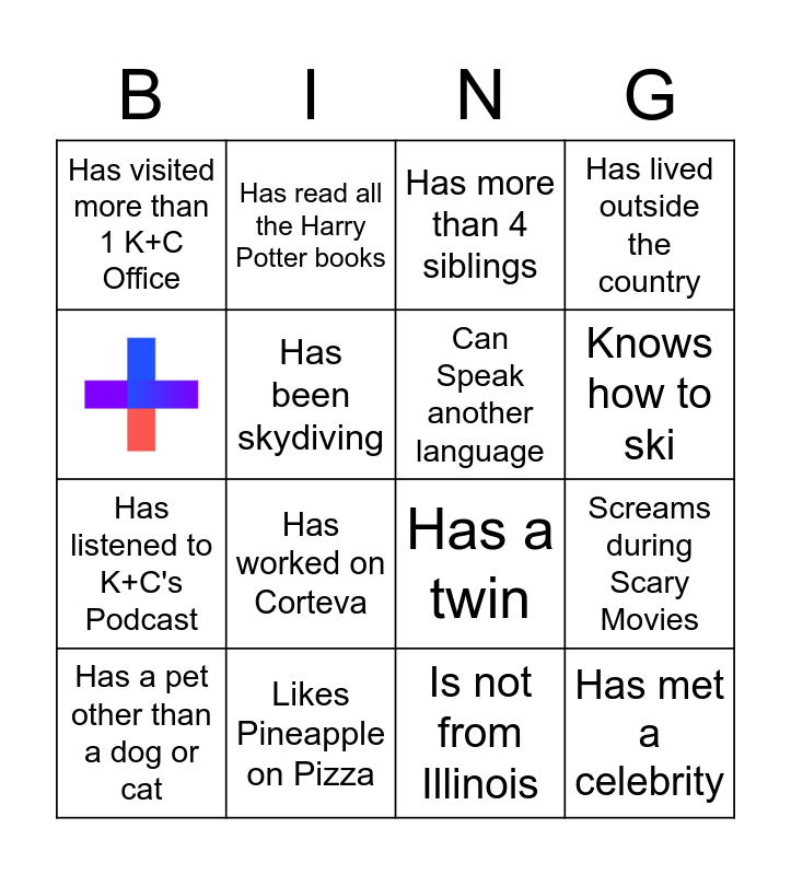 This bingo card has 1 images and 15 words: Likes Pineapple on Pizza, Screams during Scary Movies, Has more than 4 siblings, Has visited more than 1 K+C Office, Has listened to K+C's Podcast, Has read all the Harry Potter books, Has a twin, Is not from Illinois, Has been skydiving, Has a pet other than a dog or cat, Has lived outside the country, Has worked on Corteva, Knows how to ski, Can Speak another language and Has met a celebrity.