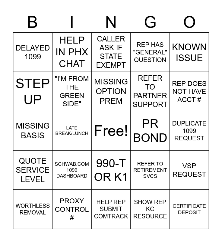 This bingo card has a free space and 34 words: SORRENTO/SCILEX SPINOFF, EXPLAIN PAID/ADJ COLUMN, WASH SALE, CORRECTED 1099 REQUEST, DUPLICATE 1099 REQUEST, STEP UP, "I'M FROM THE GREEN SIDE", HELP REP SUBMIT COMTRACK, REFER TO PARTNER SUPPORT, CERTIFICATE DEPOSIT, MISSING BASIS, HELP IN PHX CHAT, SHOW REP KC RESOURCE, END TURBO ON TIME, QUOTE SERVICE LEVEL, LATE BREAK/LUNCH, 990-T OR K1, PR BOND, VSP REQUEST, WORTHLESS REMOVAL, PROXY CONTROL #, RIGHTS OFFERING, REP HAS "GENERAL" QUESTION, REP DOES NOT HAVE ACCT #, DRS OUT, SCHWAB.COM 1099 DASHBOARD, CALLER ASK IF STATE EXEMPT, PCAT, KNOWN ISSUE, DELAYED 1099, CPA HAS QUESTION, MISSING OPTION PREM, REFER TO RETIREMENT SVCS and OUT OF BALANCE.