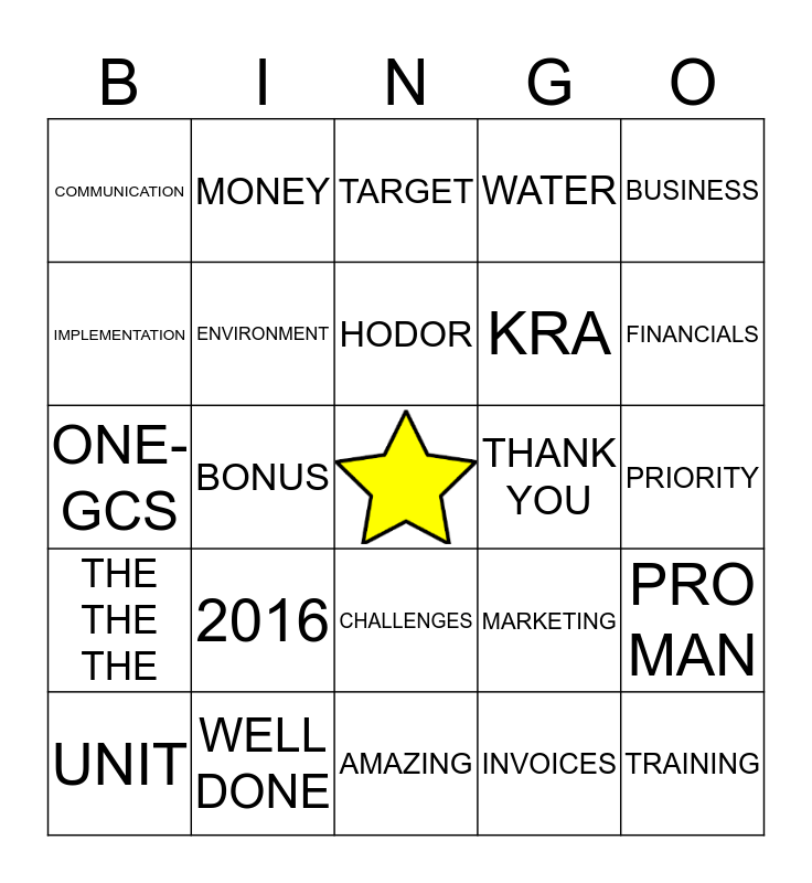 This bingo card has a free space and 24 words: 2016, WELL DONE, HODOR, UNIT, BUSINESS, COMMUNICATION, IMPLEMENTATION, MONEY, THANK YOU, CHALLENGES, KRA, ONE-GCS, MARKETING, PRO MAN, ENVIRONMENT, INVOICES, PRIORITY, TARGET, FINANCIALS, BONUS, TRAINING, THE THE THE, WATER and AMAZING.