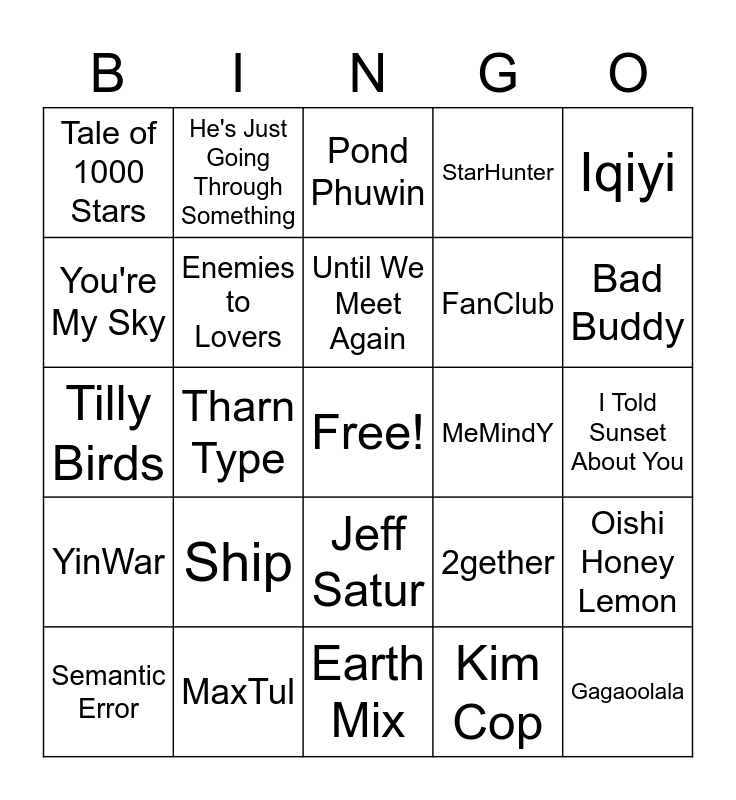 This bingo card has a free space and 36 words: CutiePie The Series, GMMTV, JaFirst, Enemies to Lovers, 2gether, YinWar, Until We Meet Again, Suar, Iqiyi, JoongDunk, Tharn Type, StarHunter, ZeeNunew, MeMindY, Bad Buddy, Tale of 1000 Stars, BKPP, Ship, Gagaoolala, Pond Phuwin, I Told Sunset About You, Oishi Honey Lemon, MaxTul, Semantic Error, Earth Mix, He's Just Going Through Something, Tilly Birds, Idol Factory, FanClub, You're My Sky, Off Gun, Podd, Kim Cop, Jeff Satur, Ohm Nanon and Gemini Fourth.