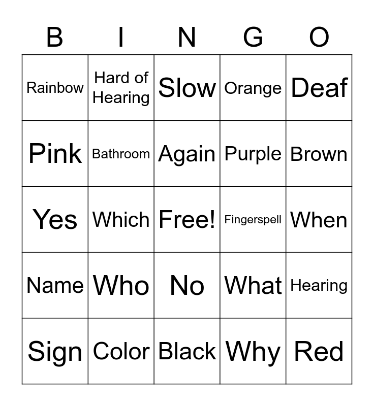 This bingo card has a free space and 32 words: Why, How, Which, Your, Name, Bathroom, Deaf, Hearing, Hard of Hearing, Ready, Again, Slow, Not understand, Meaning, Fingerspell, Help, Sign, Yes, No, Who, What, Where, When, Color, Red, Orange, Purple, Pink, Rainbow, Black, White and Brown.