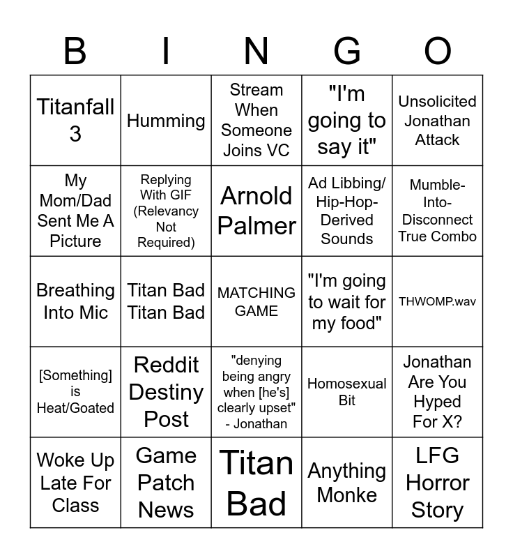 This bingo card has a free space and 24 words: Reddit Destiny Post, Game Patch News, Arnold Palmer, Woke Up Late For Class, Unsolicited Jonathan Attack, Titanfall 3, My Mom/Dad Sent Me A Picture, Humming, "I'm going to wait for my food", "denying being angry when [he's] clearly upset" - Jonathan, Ad Libbing/ Hip-Hop-Derived Sounds, Breathing Into Mic, Homosexual Bit, Jonathan Are You Hyped For X?, Replying With GIF (Relevancy Not Required), Anything Monke, THWOMP.wav, Stream When Someone Joins VC, Mumble-Into-Disconnect True Combo, Titan Bad Titan Bad, LFG Horror Story, [Something] is Heat/Goated, "I'm going to say it" and Titan Bad.
