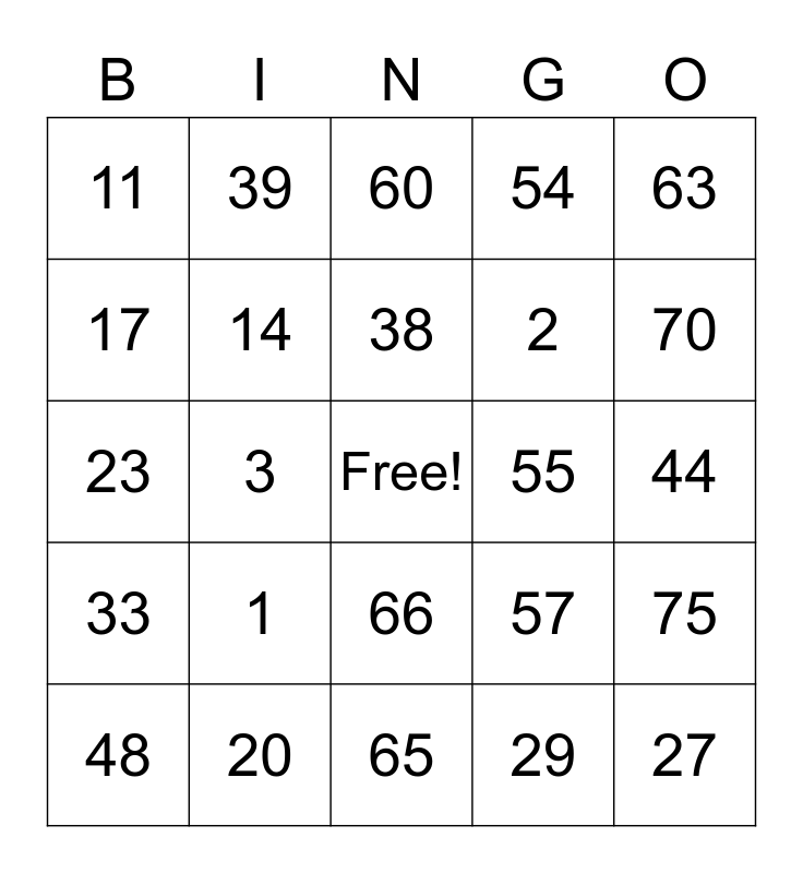 This bingo card has a free space and 24 words: 1, 20, 38, 48, 63, 11, 17, 39, 55, 66, 2, 23, 57, 75, 14, 29, 44, 60, 70, 3, 27, 33, 54 and 65.
