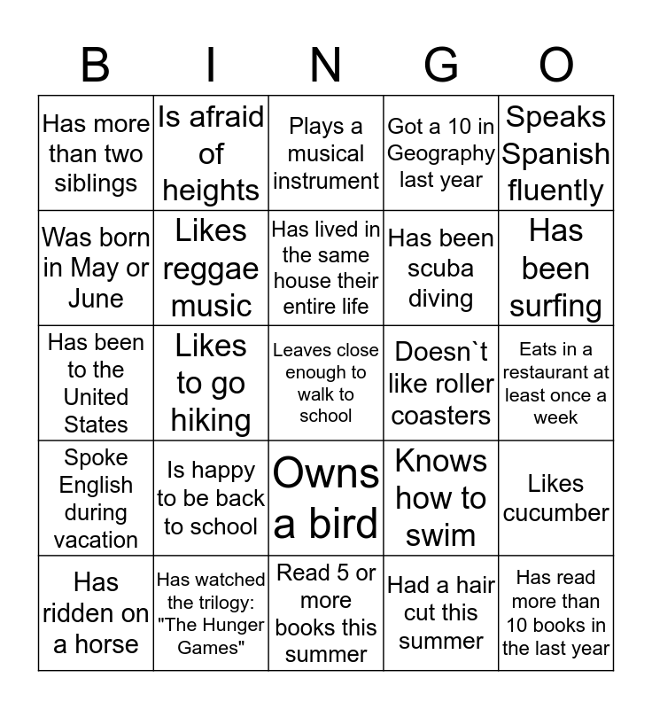 This bingo card has 25 words: Is happy to be back to school, Read 5 or more books this summer, Has lived in the same house their entire life, Has ridden on a horse, Speaks Spanish fluently, Has more than two siblings, Was born in May or June, Is afraid of heights, Doesn`t like roller coasters, Owns a bird, Has been scuba diving, Has been to the United States, Knows how to swim, Likes cucumber, Likes reggae music, Has read more than 10 books in the last year, Eats in a restaurant at least once a week, Plays a musical instrument, Has been surfing, Likes to go hiking, Leaves close enough to walk to school, Has watched the trilogy: "The Hunger Games", Spoke English during vacation, Got a 10 in Geography last year and Had a hair cut this summer.