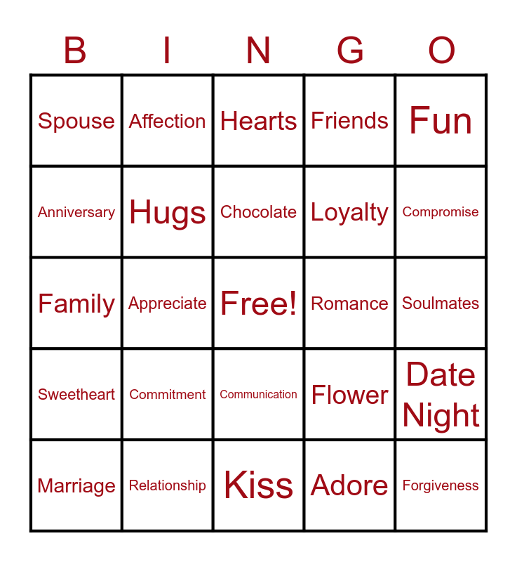 This bingo card has a free space and 27 words: Flower, Love, Loyalty, Kiss, Anniversary, Hearts, Affection, Sweetheart, Romance, Date Night, Family, Friends, Marriage, Relationship, Compromise, Gifts, Hugs, Chocolate, Commitment, Spouse, Soulmates, Adore, Appreciate, Forgiveness, Communication, Fun and Laughter.