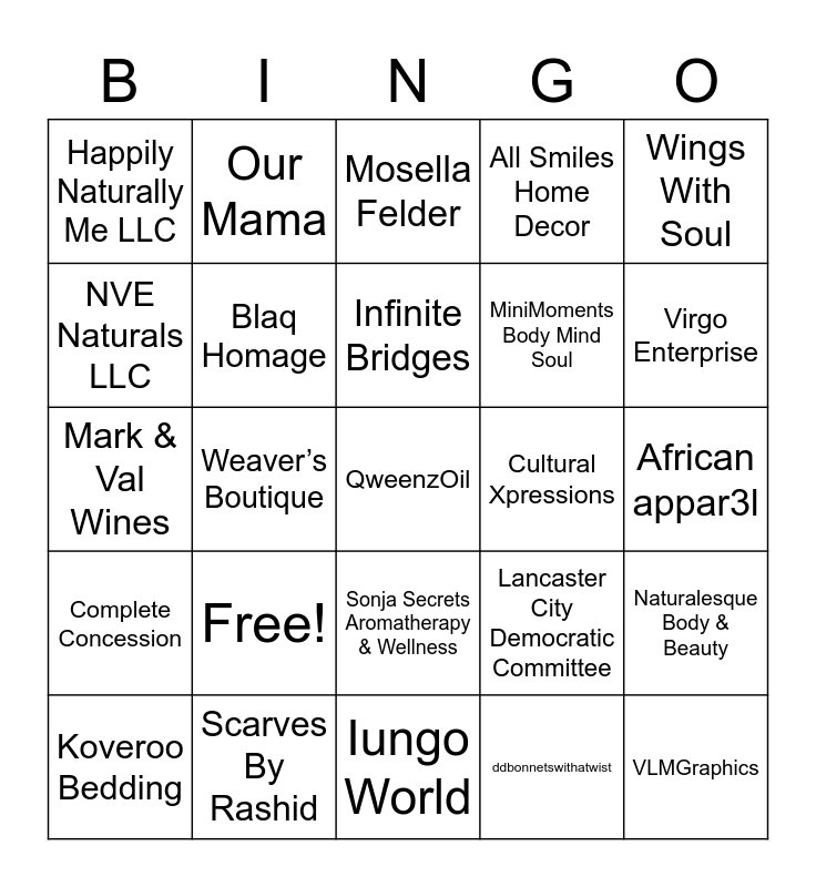 This bingo card has 25 words: Free!, Iungo World, Infinite Bridges, Koveroo Bedding, Wings With Soul, Happily Naturally Me LLC, NVE Naturals LLC, Our Mama, Cultural Xpressions, Sonja Secrets Aromatherapy & Wellness, MiniMoments Body Mind Soul, Mark & Val Wines, Lancaster City Democratic Committee, Naturalesque Body & Beauty, Blaq Homage, VLMGraphics, African appar3l, Mosella Felder, Virgo Enterprise, Weaver’s Boutique, QweenzOil, Scarves By Rashid, Complete Concession, All Smiles Home Decor and ddbonnetswithatwist.