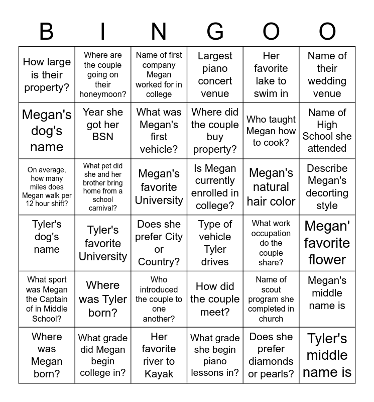 This bingo card has 36 words: How did the couple meet?, Who introduced the couple to one another?, What grade she begin piano lessons in?, Megan's dog's name, Tyler's dog's name, Is Megan currently enrolled in college?, Year she got her BSN, Her favorite river to Kayak, Her favorite lake to swim in, Name of scout program she completed in church, Name of High School she attended, Largest piano concert venue, Megan's middle name is, What pet did she and her brother bring home from a school carnival?, Where did the couple buy property?, How large is their property?, What sport was Megan the Captain of in Middle School?, Megan's natural hair color, On average, how many miles does Megan walk per 12 hour shift?, Name of first company Megan worked for in college, Megan's favorite University, Tyler's favorite University, Type of vehicle Tyler drives, Does she prefer City or Country?, What work occupation do the couple share?, Where are the couple going on their honeymoon?, Who taught Megan how to cook?, What grade did Megan begin college in?, What was Megan's first vehicle?, Name of their wedding venue, Tyler's middle name is, Where was Megan born?, Megan' favorite flower, Describe Megan's decorting style, Where was Tyler born? and Does she prefer diamonds or pearls?.