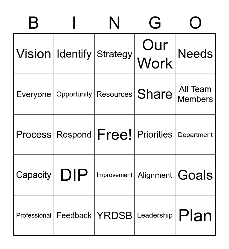 This bingo card has a free space and 28 words: Goals, Support, Share, Leadership, Everyone, Strategy, Identify, Capacity, Priorities, Professional, Process, Our Work, Feedback, YRDSB, All Team Members, Learning, DIP, Opportunity, Resources, Improvement, Vision, RAS, Plan, Respond, Department, Alignment, Needs and Connection.