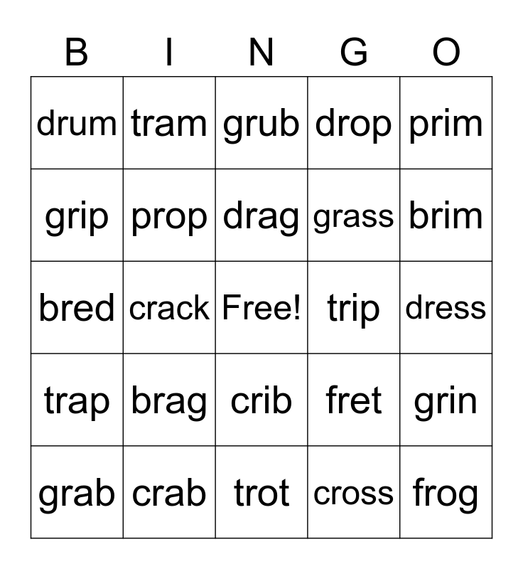 This bingo card has a free space and 24 words: brag, crab, drag, grab, prim, drum, grip, tram, trip, crib, grass, bred, fret, grin, prop, cross, dress, grub, brim, crack, frog, trap, drop and trot.