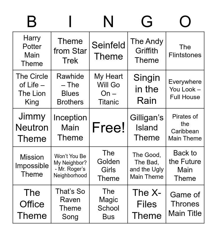 This bingo card has a free space and 43 words: Pokémon Theme, Game of Thrones Main Title, I’ll Be There For You – Friends, The Office Theme, Stranger Things Main Theme, The X-Files Theme, Seinfeld Theme, The Fresh Prince of Bel-Air, The Flintstones, That’s So Raven Theme Song, The Andy Griffith Theme, Gilligan’s Island Theme, The Golden Girls Theme, Won’t You Be My Neighbor? - Mr. Roger’s Neighborhood, Theme from the Walking Dead, The Magic School Bus, Adams Family Theme Song, Jimmy Neutron Theme, Baywatch Theme, Everywhere You Look – Full House, Theme from Star Trek, Star Wars Main Theme, Concerning Hobbits – The Lord of the Rings, Harry Potter Main Theme, Theme from Jurassic Park, Pirates of the Caribbean Main Theme, Pink Panther Theme, The Imperial March – Star Wars, The Good, The Bad, and the Ugly Main Theme, Mission Impossible Theme, James Bond Theme, Back to the Future Main Theme, Flying Theme – E.T., Inception Main Theme, Halloween Theme, Theme from Raiders of the Lost Ark – Indiana Jones, Over the Rainbow – The Wizard of Oz, My Heart Will Go On – Titanic, The Circle of Life – The Lion King, Singin in the Rain, Ghostbusters, Rawhide – The Blues Brothers and Grease from “Grease”.