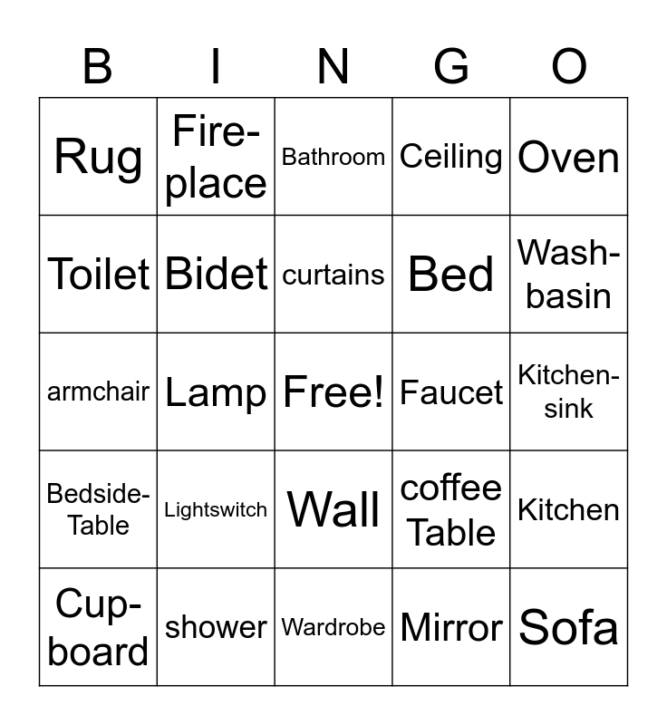 This bingo card has a free space and 24 words: Lightswitch, shower, curtains, Cup-board, Oven, Rug, Toilet, Fire-place, Faucet, Wall, Bed, armchair, coffee Table, Kitchen, Bidet, Mirror, Kitchen-sink, Bathroom, Wash-basin, Lamp, Sofa, Bedside-Table, Ceiling and Wardrobe.