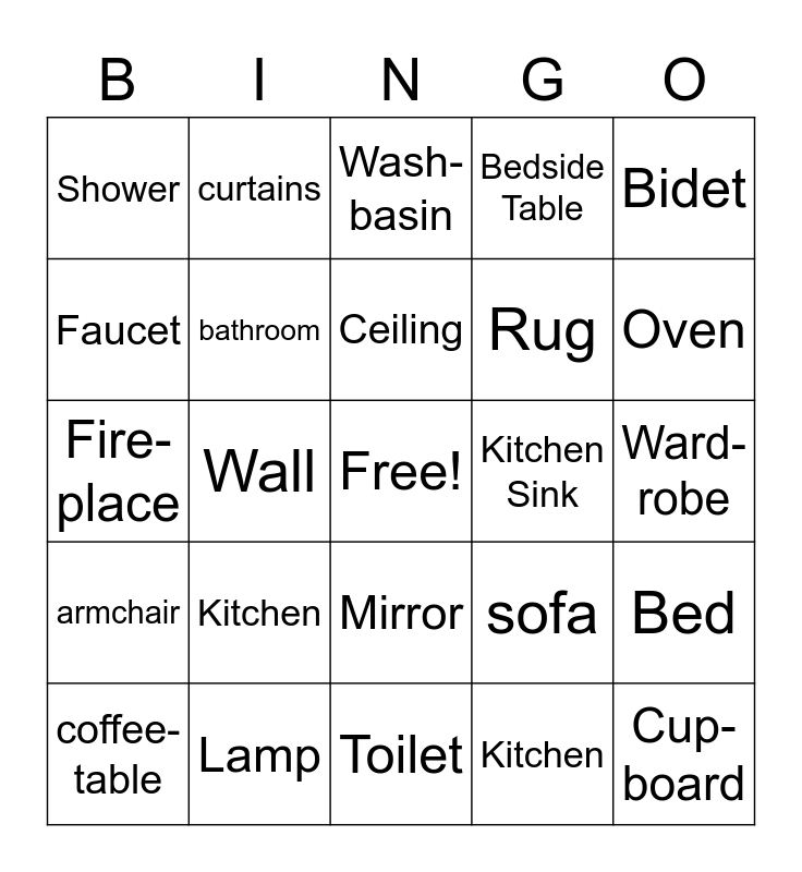 This bingo card has a free space and 24 words: Kitchen, Lamp, Ceiling, coffee-table, Bidet, Shower, Faucet, curtains, Kitchen Sink, Mirror, Rug, Fire-place, sofa, Bed, bathroom, Kitchen, Ward-robe, Wash-basin, Oven, Wall, Cup-board, armchair, Bedside Table and Toilet.