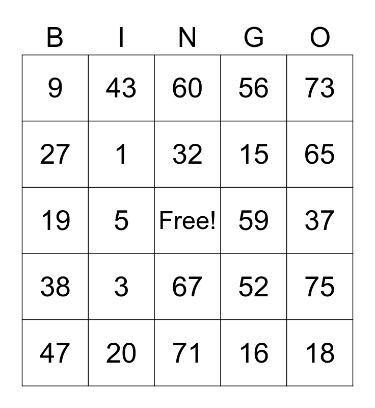 This bingo card has a free space and 24 words: 3, 20, 32, 47, 73, 9, 27, 43, 59, 67, 15, 19, 52, 75, 1, 16, 37, 60, 65, 5, 18, 38, 56 and 71.