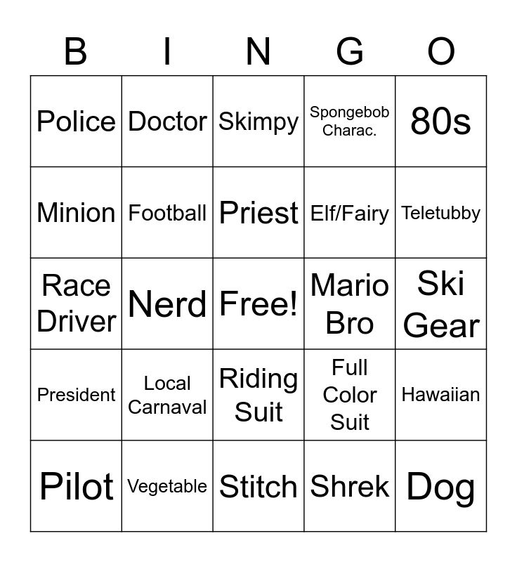 This bingo card has a free space and 24 words: Local Carnaval, Vegetable, Priest, Pilot, 80s, Police, Minion, Doctor, Mario Bro, Riding Suit, Elf/Fairy, Race Driver, Full Color Suit, Hawaiian, Football, Shrek, Ski Gear, Skimpy, Teletubby, Nerd, Dog, President, Spongebob Charac. and Stitch.