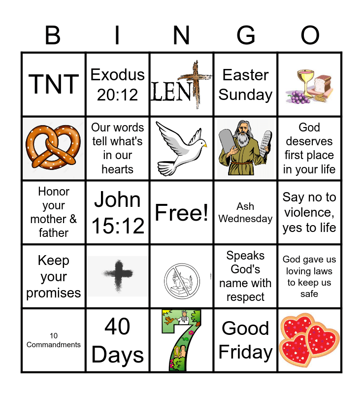 This bingo card has 9 images, a free space and 15 words: 40 Days, 10 Commandments, TNT, Exodus 20:12, Ash Wednesday, Honor your mother & father, Speaks God's name with respect, God gave us loving laws to keep us safe, Our words tell what's in our hearts, Good Friday, Say no to violence, yes to life, God deserves first place in your life, John 15:12, Keep your promises and Easter Sunday.