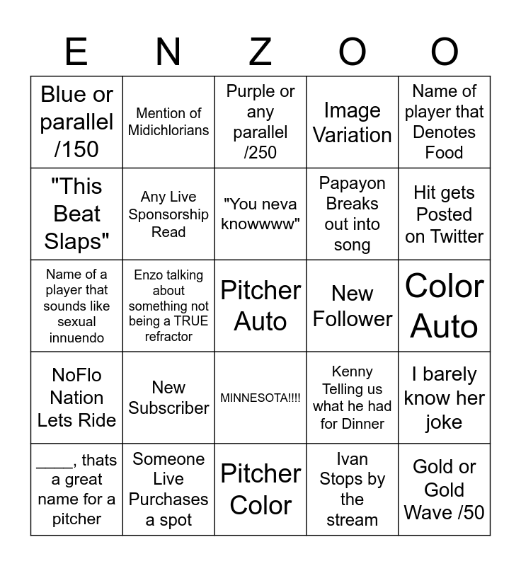 This bingo card has 29 words: ____, thats a great name for a pitcher, Papayon saying Boom X3, Enzo talking about something not being a TRUE refractor, Gold or Gold Wave /50, Blue or parallel /150, Purple or any parallel /250, Any Live Sponsorship Read, New Subscriber, New Follower, Someone Live Purchases a spot, Color Auto, Pitcher Auto, Pitcher Color, Ivan Stops by the stream, Hit gets Posted on Twitter, Poet Laureate Waka Flocka Flame, MINNESOTA!!!!, NoFlo Nation Lets Ride, Name of player that Denotes Food, Name of a player that sounds like sexual innuendo, Kenny Telling us what he had for Dinner, Enzo Breaks out into Song, Papayon Breaks out into song, "This Beat Slaps", Image Variation, Mention of Midichlorians, I barely know her joke, "You neva knowwww" and Ill be your huckleberry.