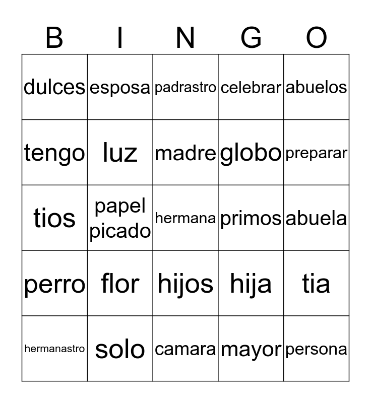 This bingo card has a free space and 24 words: flor, solo, madre, hermanastro, abuelos, dulces, tengo, esposa, primos, hijos, globo, tios, hija, tia, luz, mayor, abuela, padrastro, preparar, papel picado, persona, perro, celebrar and camara.