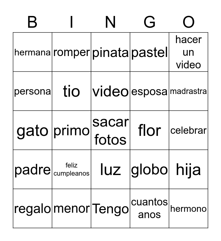 This bingo card has a free space and 24 words: feliz cumpleanos, menor, video, regalo, hacer un video, hermana, persona, romper, flor, luz, esposa, gato, globo, hija, tio, cuantos anos, celebrar, pinata, madrastra, primo, hermono, padre, pastel and Tengo.