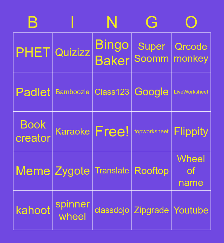This bingo card has a free space and 24 words: kahoot, Zygote, Class123, Zipgrade, Qrcode monkey, PHET, Quizizz, Bingo Baker, topworksheet, Flippity, Book creator, Bamboozle, Rooftop, Wheel of name, Padlet, spinner wheel, classdojo, Super Soomm, LiveWorksheet, Meme, Karaoke, Translate, Google and Youtube.
