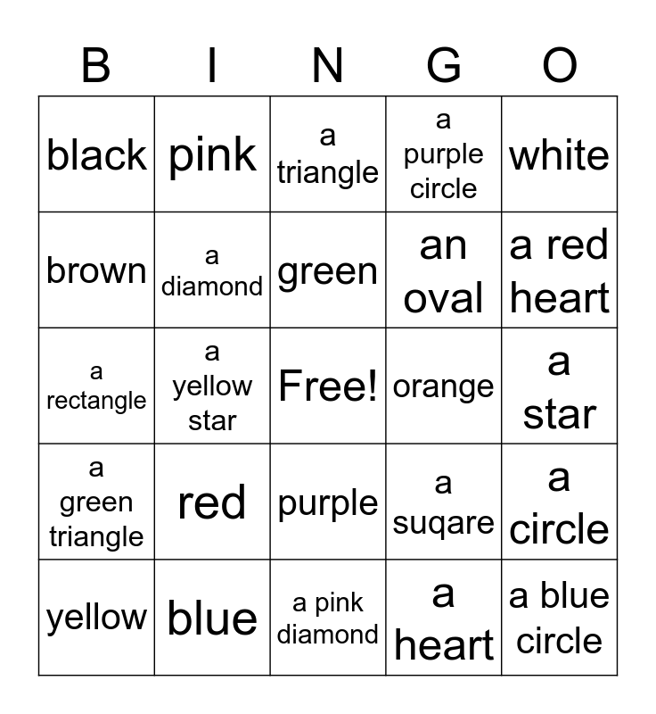 This bingo card has a free space and 24 words: red, blue, green, yellow, white, black, brown, pink, orange, purple, an oval, a rectangle, a suqare, a circle, a diamond, a heart, a star, a triangle, a red heart, a yellow star, a blue circle, a green triangle, a purple circle and a pink diamond.