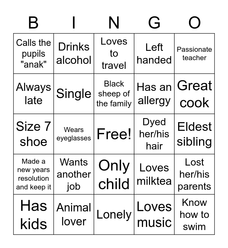 This bingo card has a free space and 24 words: Wants another job, Animal lover, Black sheep of the family, Has kids, Passionate teacher, Calls the pupils "anak", Always late, Drinks alcohol, Dyed her/his hair, Only child, Has an allergy, Size 7 shoe, Loves milktea, Lost her/his parents, Single, Loves music, Eldest sibling, Loves to travel, Great cook, Wears eyeglasses, Know how to swim, Made a new years resolution and keep it, Left handed and Lonely.